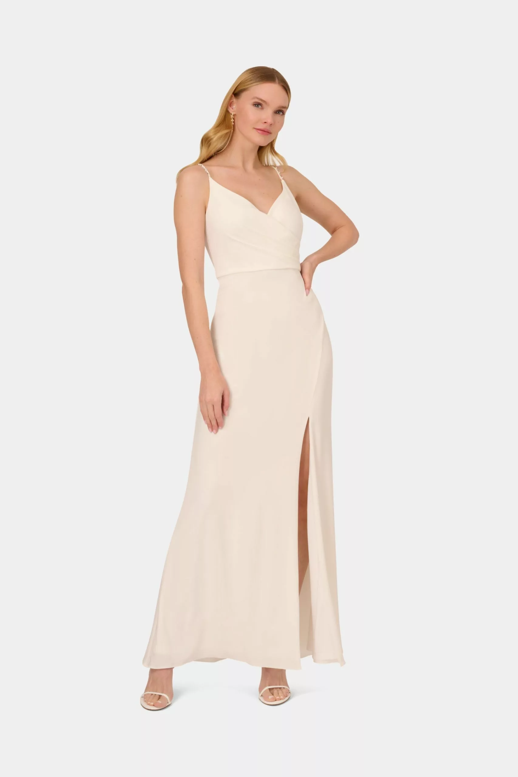 Look stylish and chic in this Jersey Draped Gown that features a spaghetti beaded strap and thigh high slit. Pair this stunning gown with strappy heels and drop earrings to complete your look.