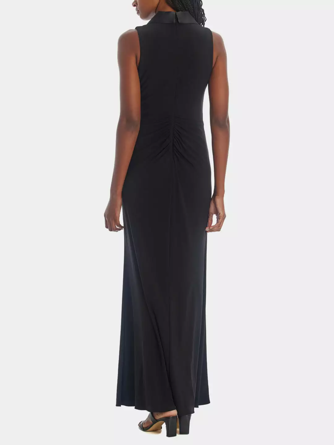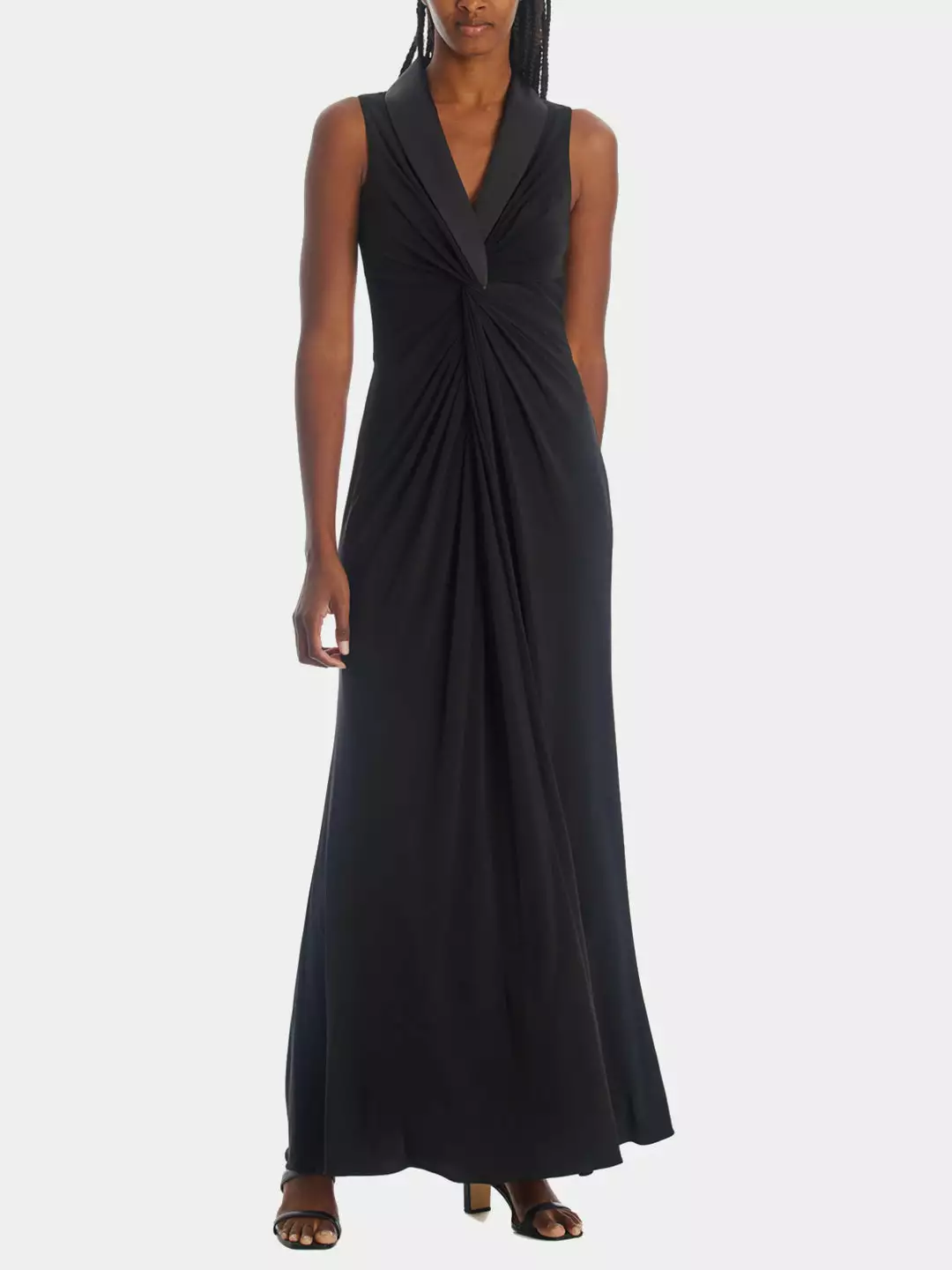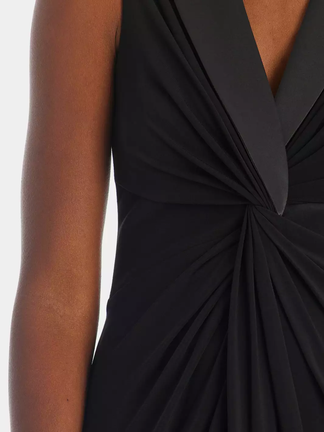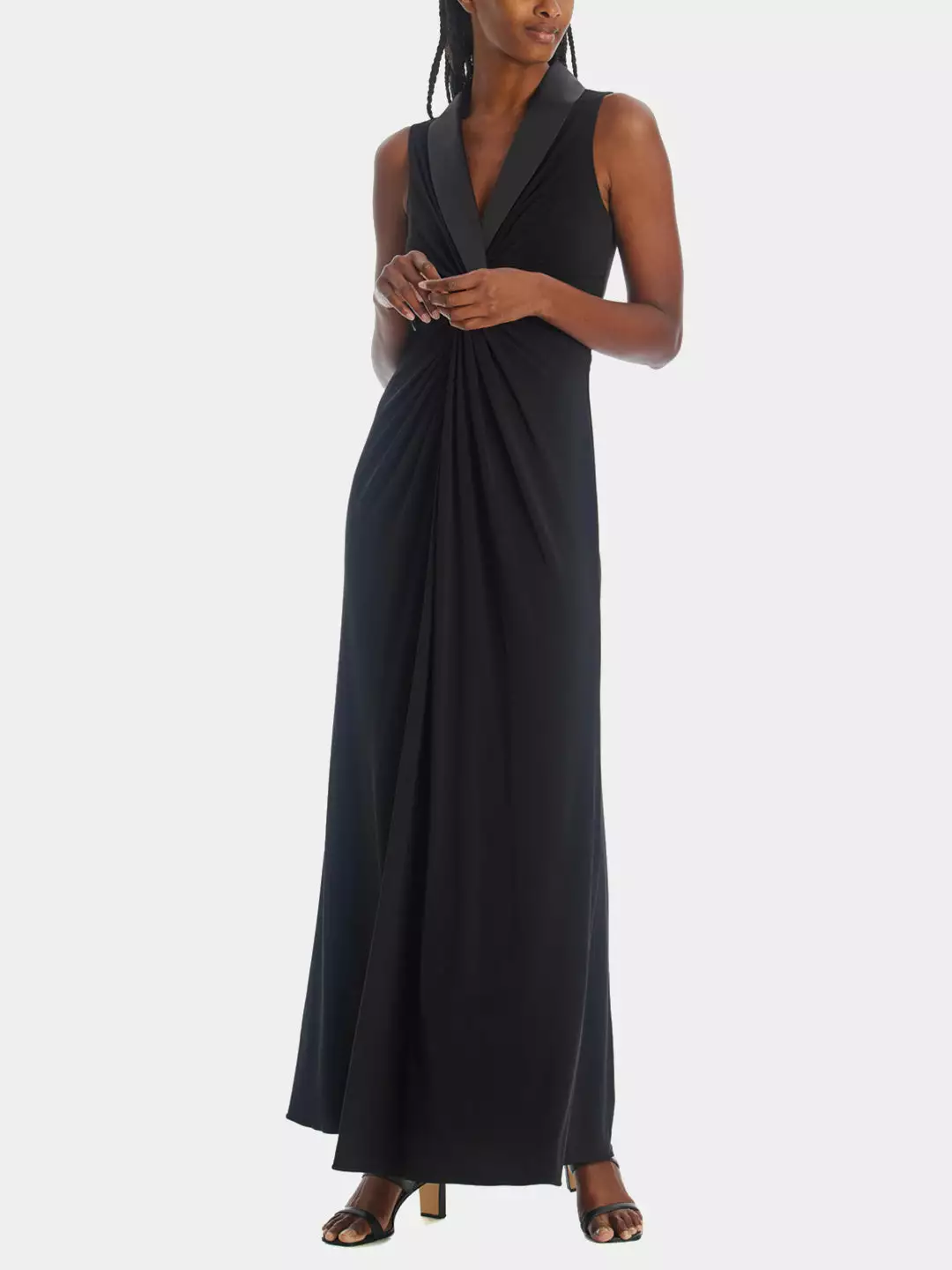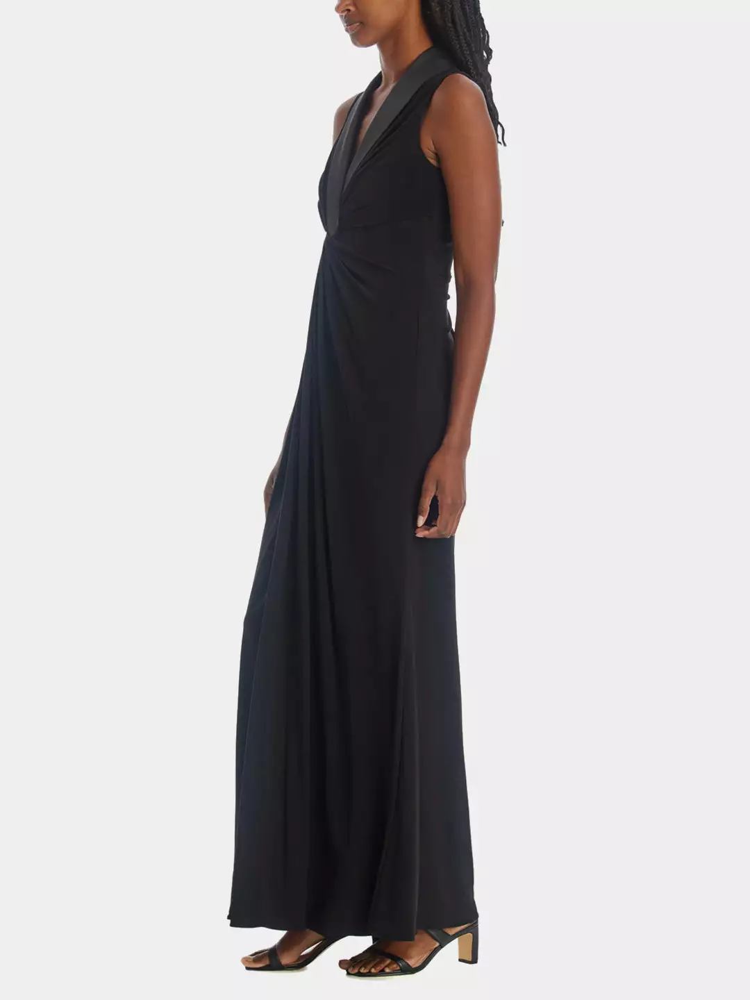 Borrowing from the dapper style of a tuxedo, this sultry gown has all the coolest details.