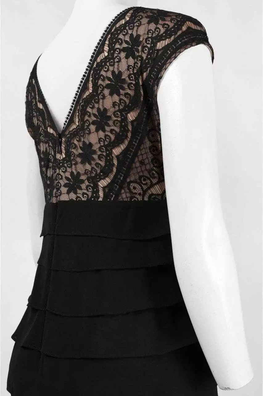Show off your trendsetting style when you wear this Adrianna Papell 041837860. Showcases cap sleeves and a v-neckline. The bodice is richly decorated with lace appliques over the nude lining. The Chiffon skirt gives off a sheath silhouette with tiered details. The back boasts a v-cut and zipper closure. This Adrianna Papell ensemble will make sure you turn heads all night long.