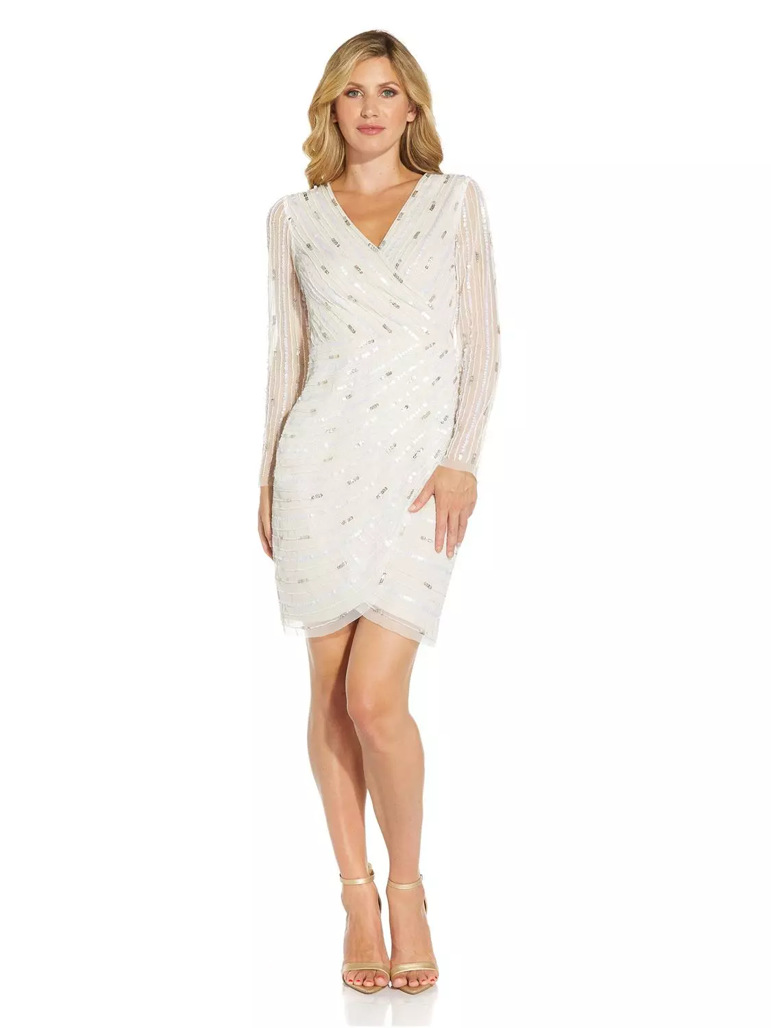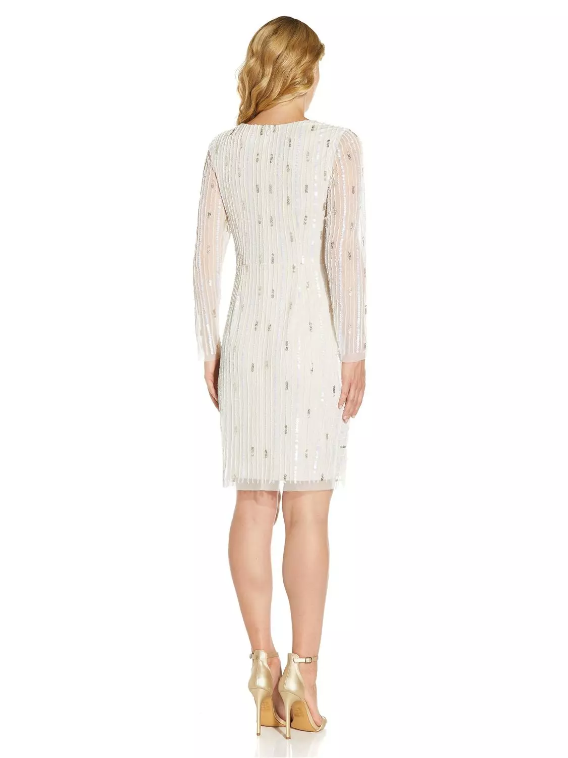Beauty in simplicity. Our stunning hand-beaded sheath dress, accented with streamlined long sleeves and subtle, shimmering pattern work. In a forever-trending and always elegant midi length.