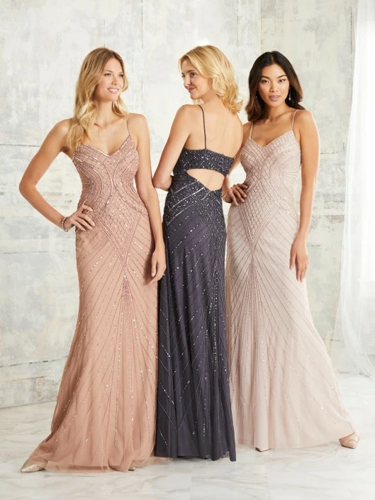 Style 40254 from Adrianna Papell Platinum is an Art Deco inspired allover beaded tulle gown that has a keyhole back, delicate straps, stretch lining, and a slim fluted skirt.
