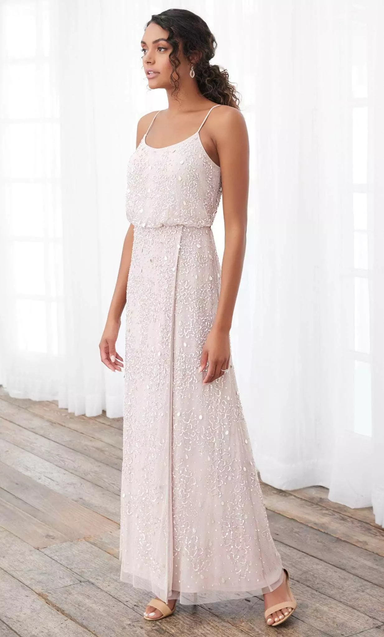 | Details: | Sleeveless, Spaghetti straps, Blouson, Sequins, Beads, Slit, Mid back, Full length |