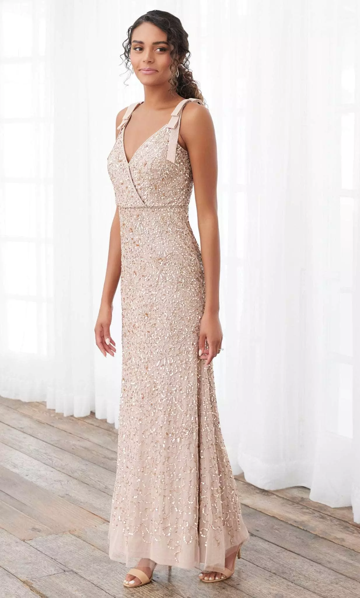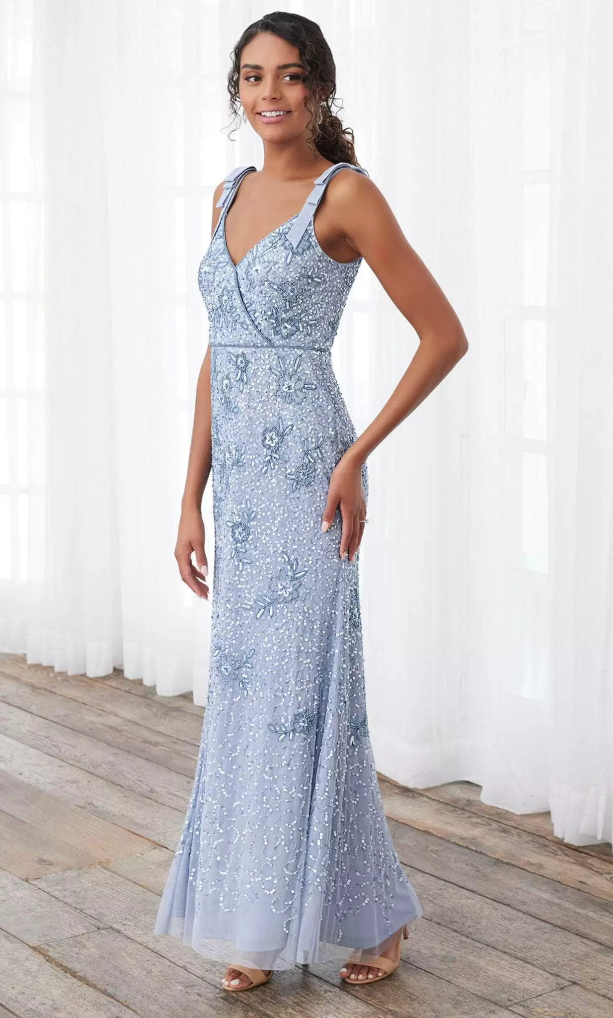 Fill the room with warmth and light in this radiant formal gown by House of Wu 40397. Perfect for a summer evening occasion, this sleeveless full length gown offers a simple faux wrap style. The fitted bodice features a V-neckline and thin straps adorned with ribbons. The figure is ever so elegant in a slim flare silhouette, styled with phenomenal floral beadwork showered over mesh fabric. You are a breath of fresh air in this dreamy House of Wu 40397 Models are wearing Misty Blue and Taupe color.