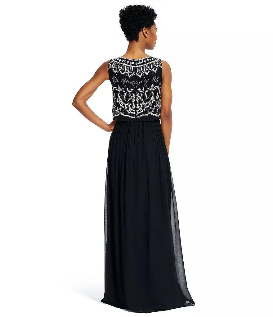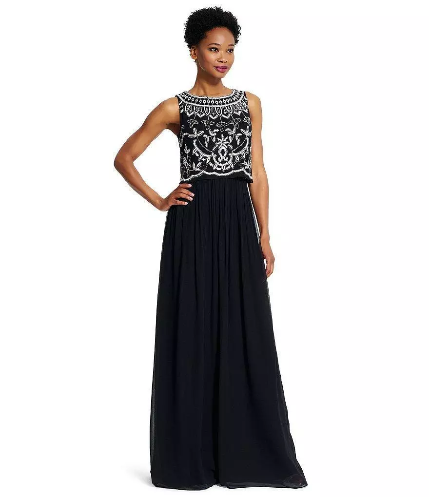 Get that royal look with this dress by Adrianna Papell 91928840. This dress features a bateau neck, sleeveless, pop over bodice and ornate contrast beading. It is a floor-length chiffon skirt with delicate gathers. This Adrianna Papell creation is an absolute breath taking look.