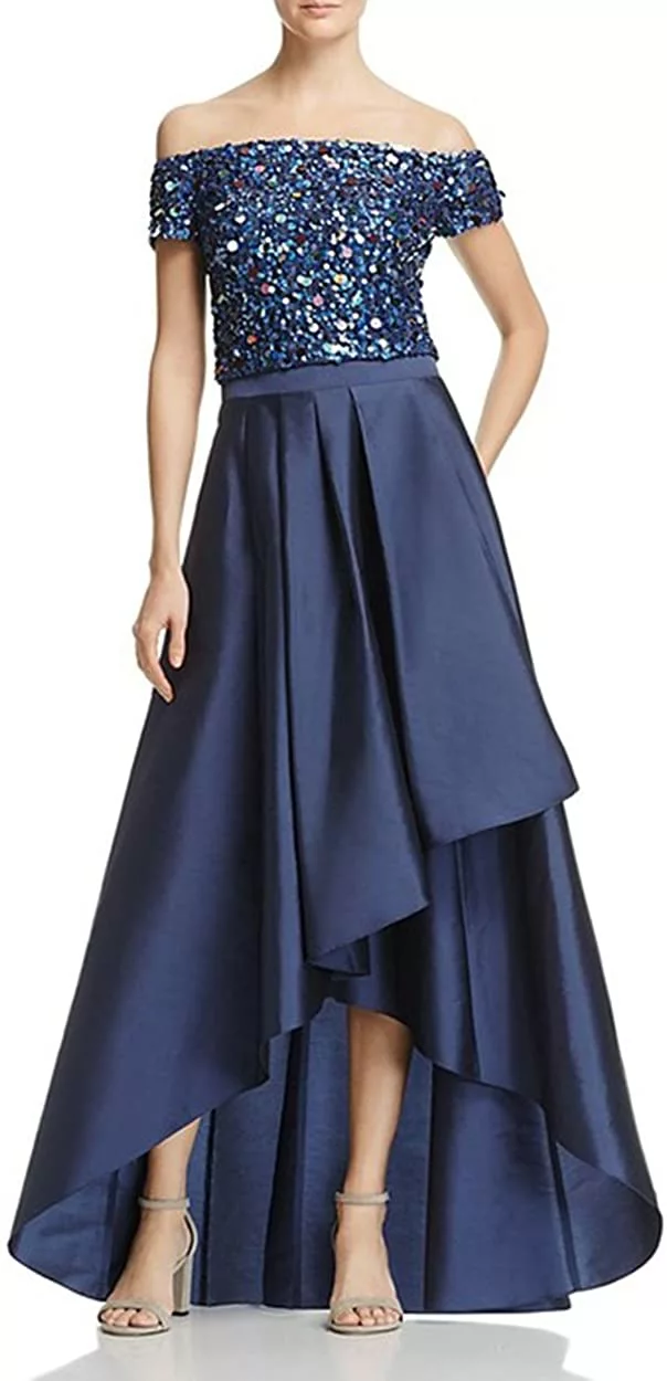 Sparkle and captivate from all angles under the limelight in this spectacularly ornate Adrianna Papell AP1E201583 creation. Shimmering with an array of sequins, this charming piece shows an off-shoulder neckline and mid-open back with a zipper closure. Cinched at the waist with a band, the taffeta A-line skirt flaunts box-pleats that wraps down to flow down stunningly to a high-low hemline. Look elegant and polished in this upscale Adrianna Papell masterpiece.