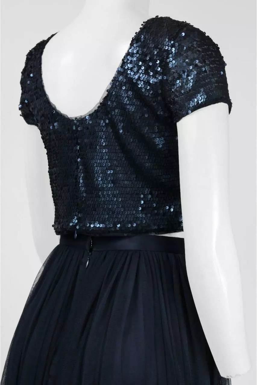 | Details: | Sequined Bodice, Short Sleeves, Ruched Chiffon Skirt, Scoop Back |