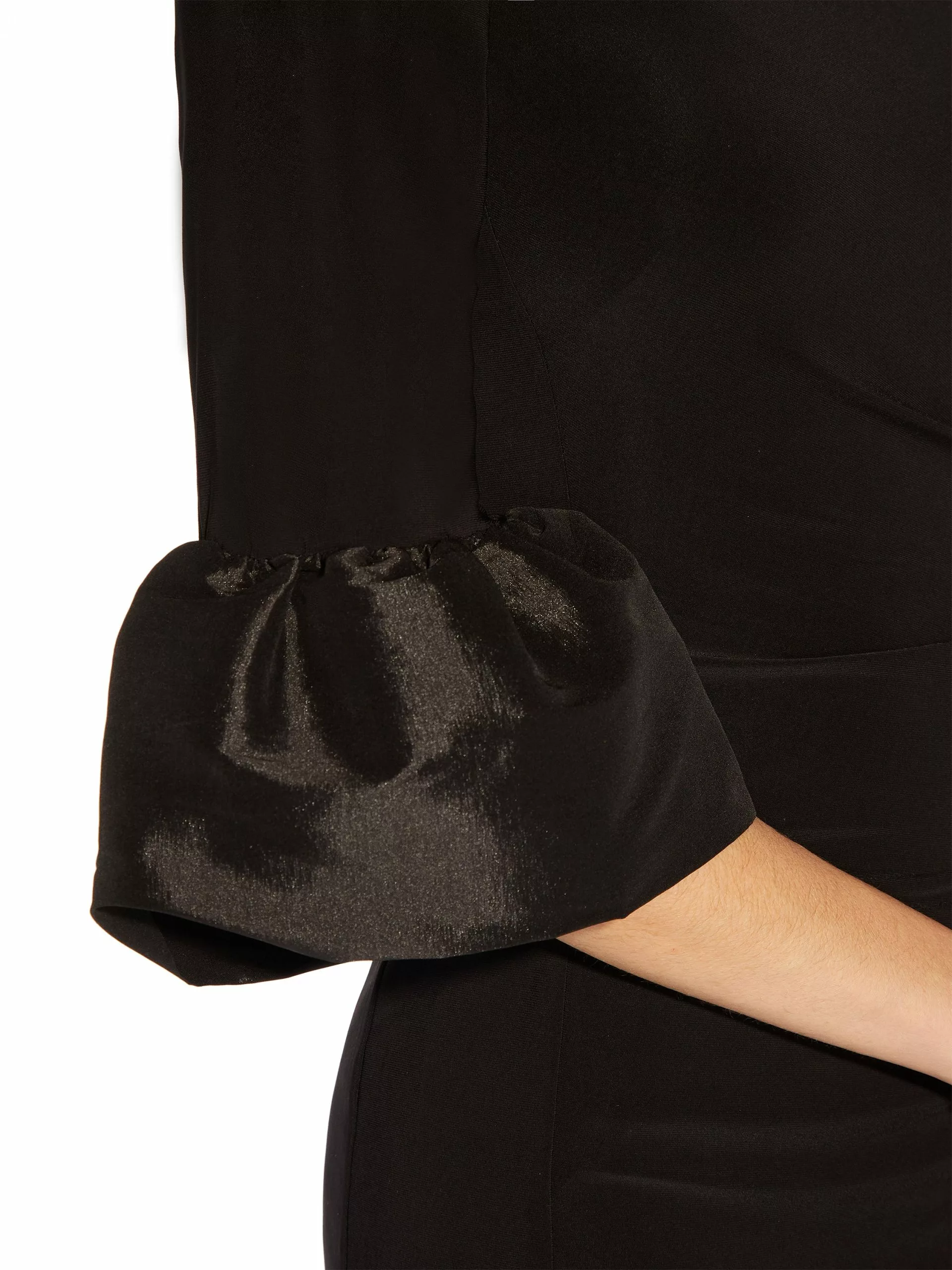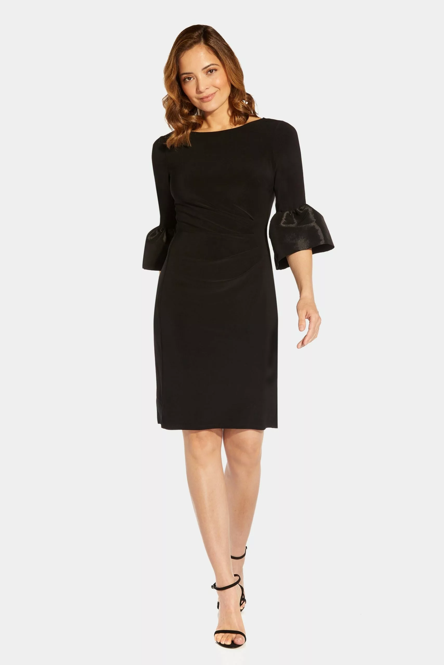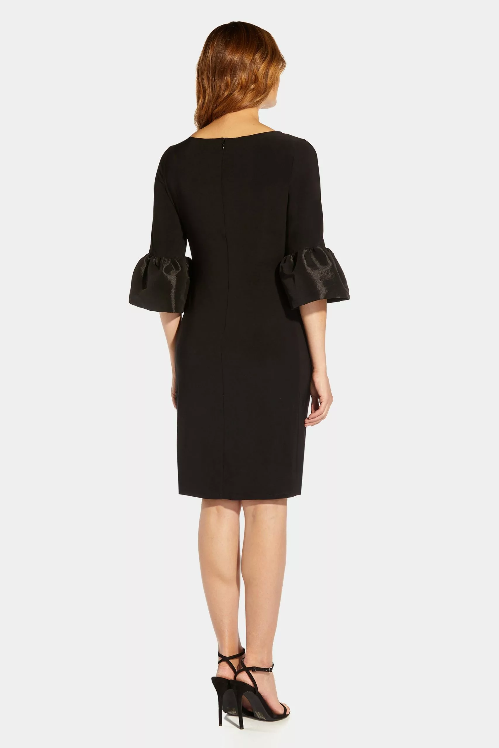 Classic sheath dress, loved by all for its sophisticated beauty and streamlined fit. This wardrobe staple is made from a comfortable stretch jersey knit fabric and gets updated with elbow length bell sleeves crafted of a crisp, smooth taffeta fabric. Back zip closure. We’re obsessed with this iconic dress and you will have so many occasions to wear it.