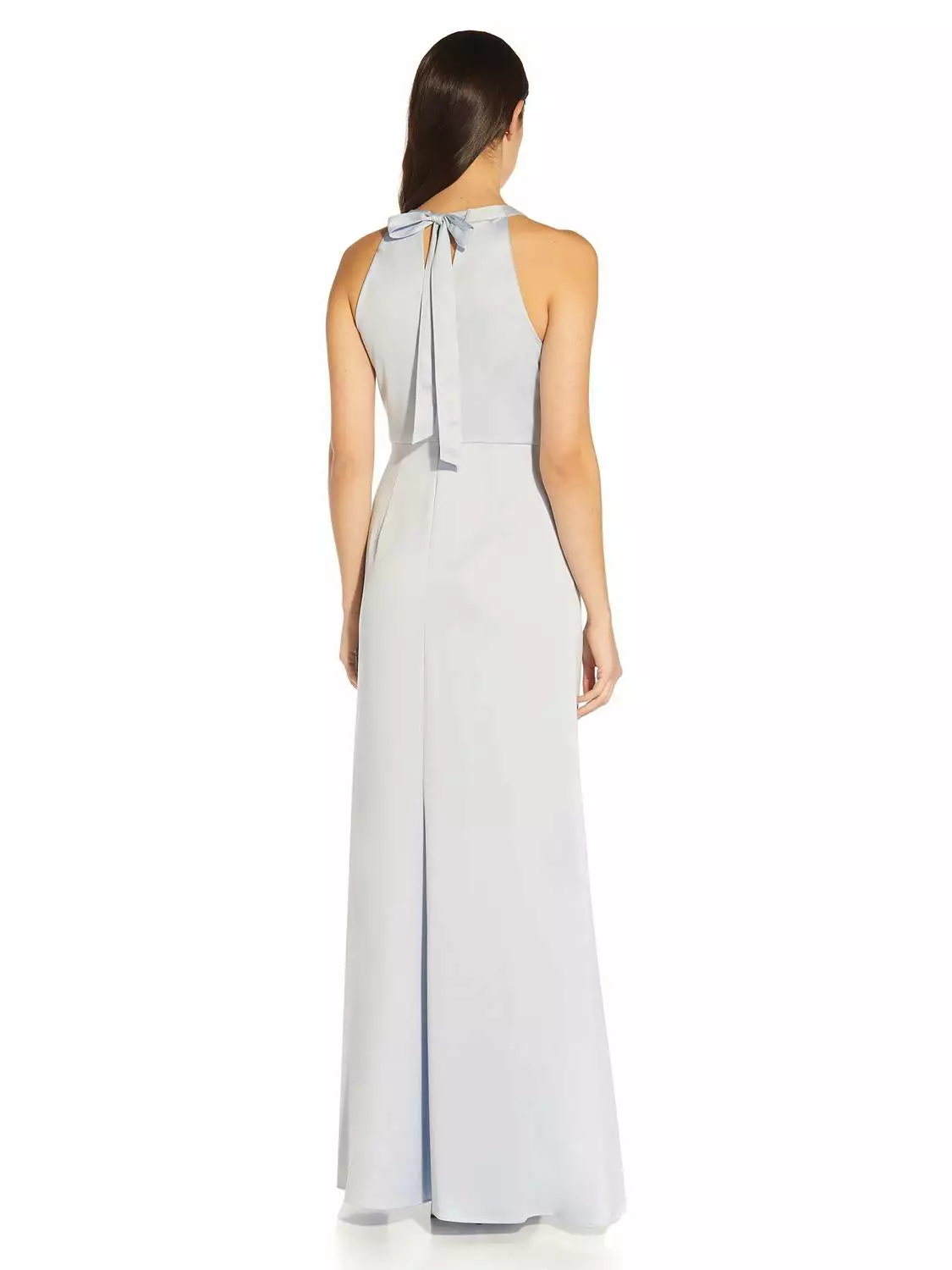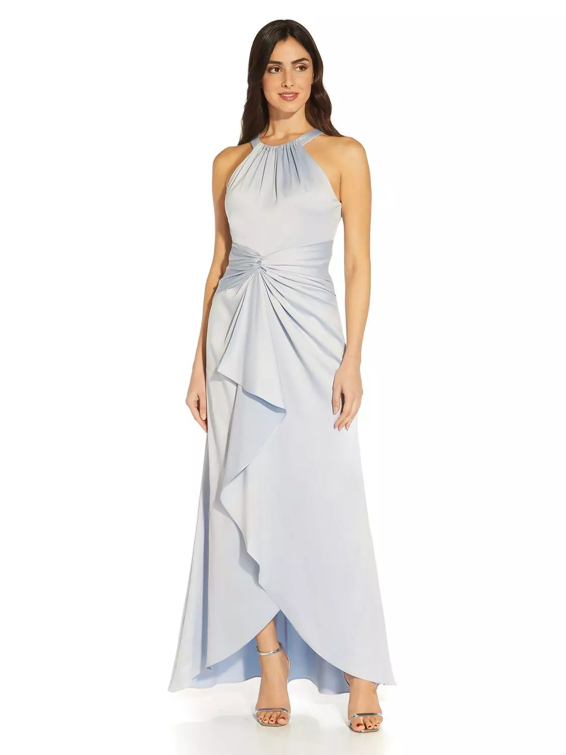 - A lovely sleeveless special occasion dress with a halter tie neckline, smooth fabrication, gathered and draped detail at waist and a modern maxi hemline.